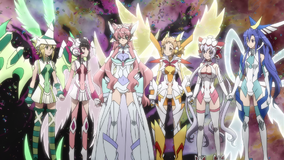 Dr. Ver says that the barrier field won't last forever, and the Nephilim unleashes some other fireball. This fourth dimension, however, Hibiki converts all half-dozen of their Superb Songs into an S2CA attack that overpowers the Nephilim's fireball. They all join hands, with Tsubasa telling Shirabe that they don't need a reason to exist drawn together, and Chris telling Kirika that there are some things even she can't change. Kirika says she knows how Chris feels. Shirabe says that she wants to believe Hibiki is more than only a hypocrite, so while she's here, she wants Hibiki to bear witness her what saving people means to her.